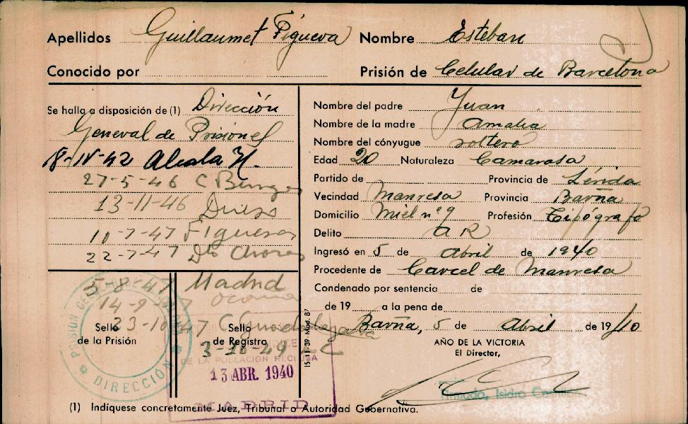 Com que el pare havia amagat tota la seva documentació al paller de Calaf, va dir als que l’interrogaven, per fer la “ficha” que tots els presos havien de tenir, que l’hi havien agafat els soldats en fer-lo presoner i que no sabia què n’havien fet. D’aquesta manera li van fer amb les dades que va donar de paraula.
