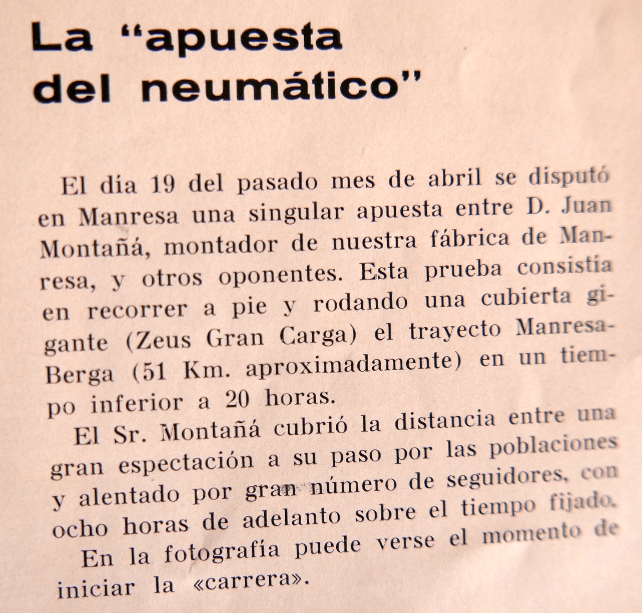 “La apuesta del neumatico” “El dia 19 del pasado mes de abril se disputó en Manresa una singular apuesta entre D. Juan Montañá, montador de nuestra fabrica en Manresa, y otros oponentes.