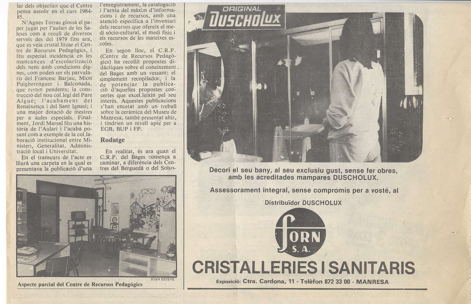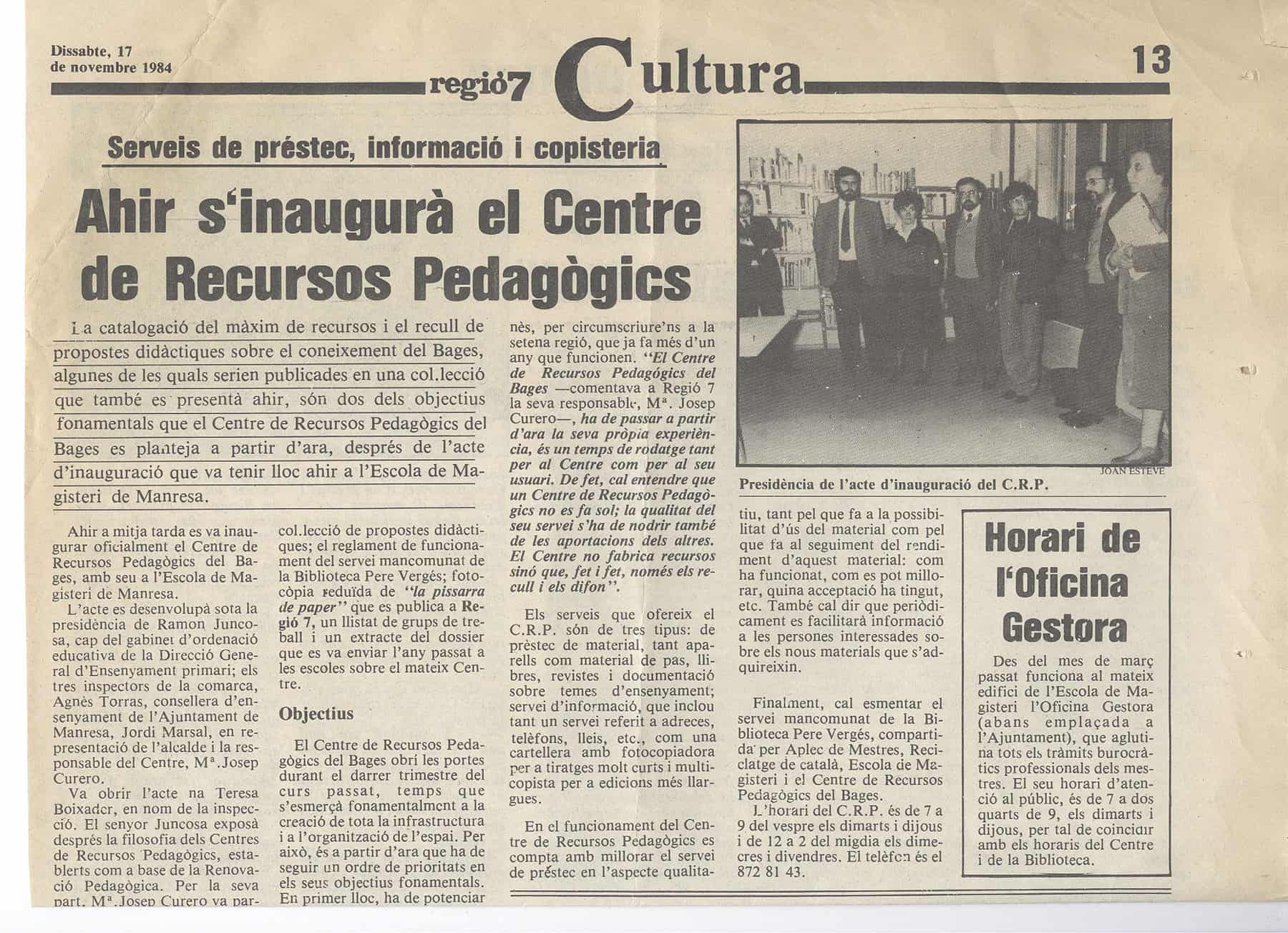 Una peça fonamental en aquesta tasca va ser la creació d’una xarxa comarcal de Centres de Recursos Pedagògics. El de Manresa va començar a funcionar de cara als mestres el setembre de 1984, però mig any abans n’havia estat nomenada com a responsable Maria Josep Curero per preparar-ne tota la infraestructura i l’organització dels materials. La regidora d’Ensenyament d’aquell moment, l’Agnès Torras, va fer totes les gestions necessàries perquè l’equipament pogués començar a funcionar a l’Aulari de les Saleses, uns mòduls prefabricats que aixoplugaven l’Escola d’Adults i Magisteri i on més tard s’hi instal·larien l’Oficina Gestora d’Ensenyament i l’EAP. Per reforçar la tasca que estava fent la Maria Josep Curero, el març de 1986 vaig ser nomenat al Centre de Recursos com a especialista en Ciències Socials. El setembre s’hi incorporà la Pilar Solanich com a mestra de suport a l’escola rural. Dos anys més tard hi entrà la Loreto Mañosa i s’obrí una delegació del CRP al Moianès amb l’Àngels Baldellou.