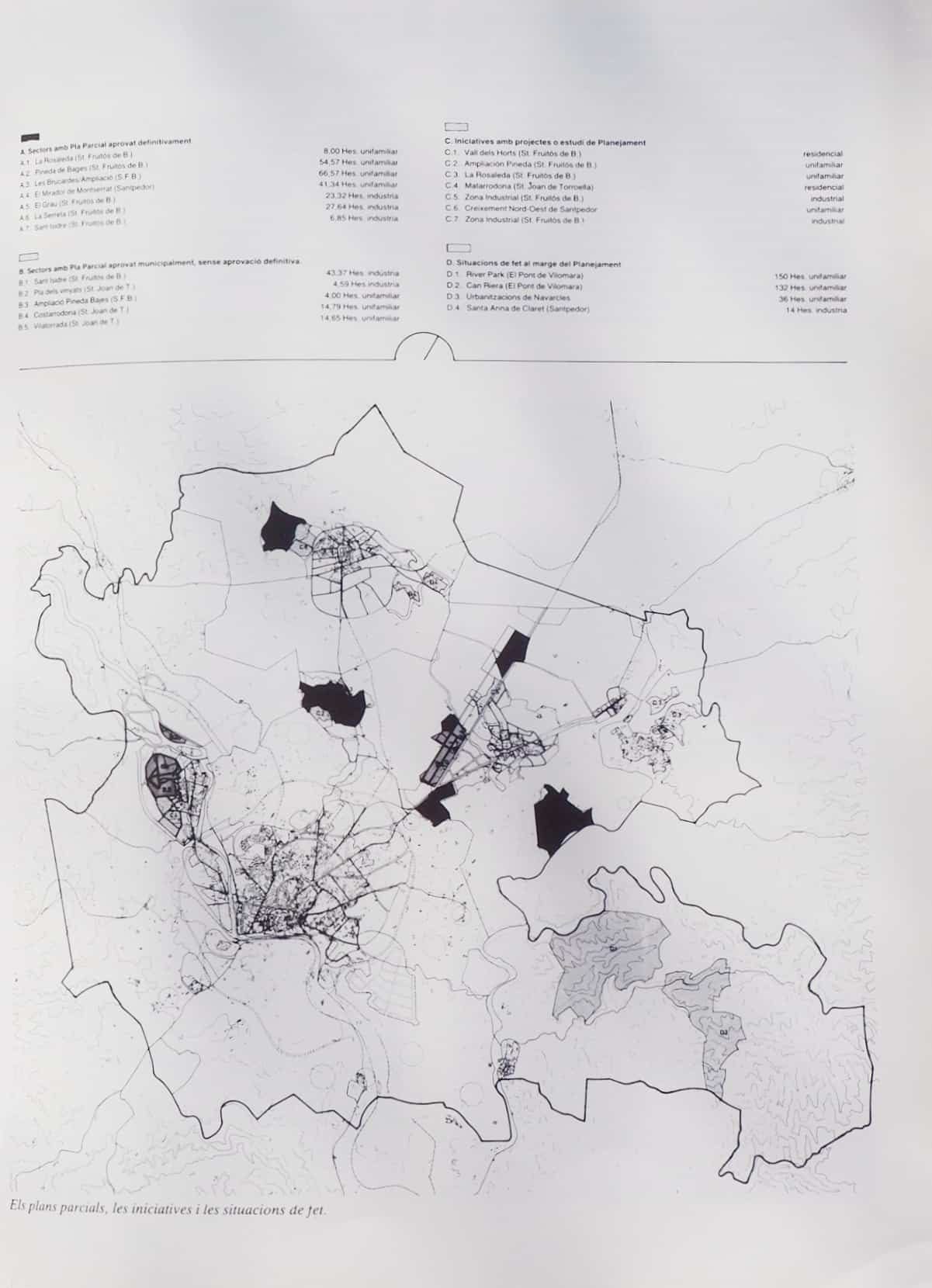 Respecte de la superfície residencial i industrial ocupada, aquesta era molt inferior a la reserva feta en els diferents planejaments. Tots els municipis tenien plans generals però només Sant Joan de Vilatorrada havia començat a actualitzar-lo en funció de la nova Llei del Sòl, i Navarcles tenia Normes Subsidiàries. En tots els casos hi havia hagut poc control dels processos d’urbanització, parcel·lació i edificació, i, per tant, ens trobàvem davant d’una gran dispersió de les edificacions existents i de l’impacte que això suposava en el territori.