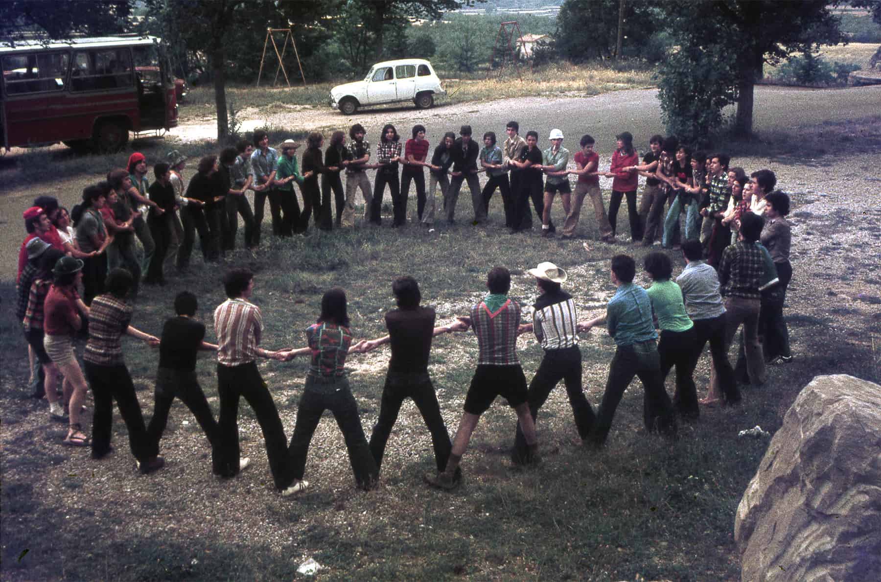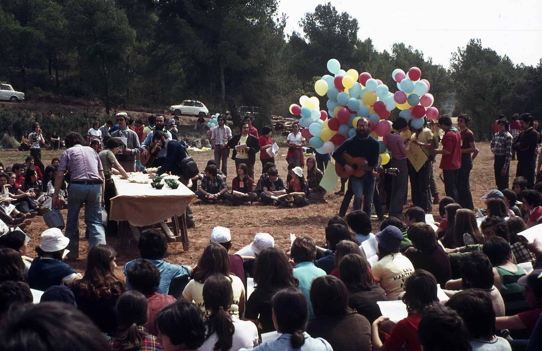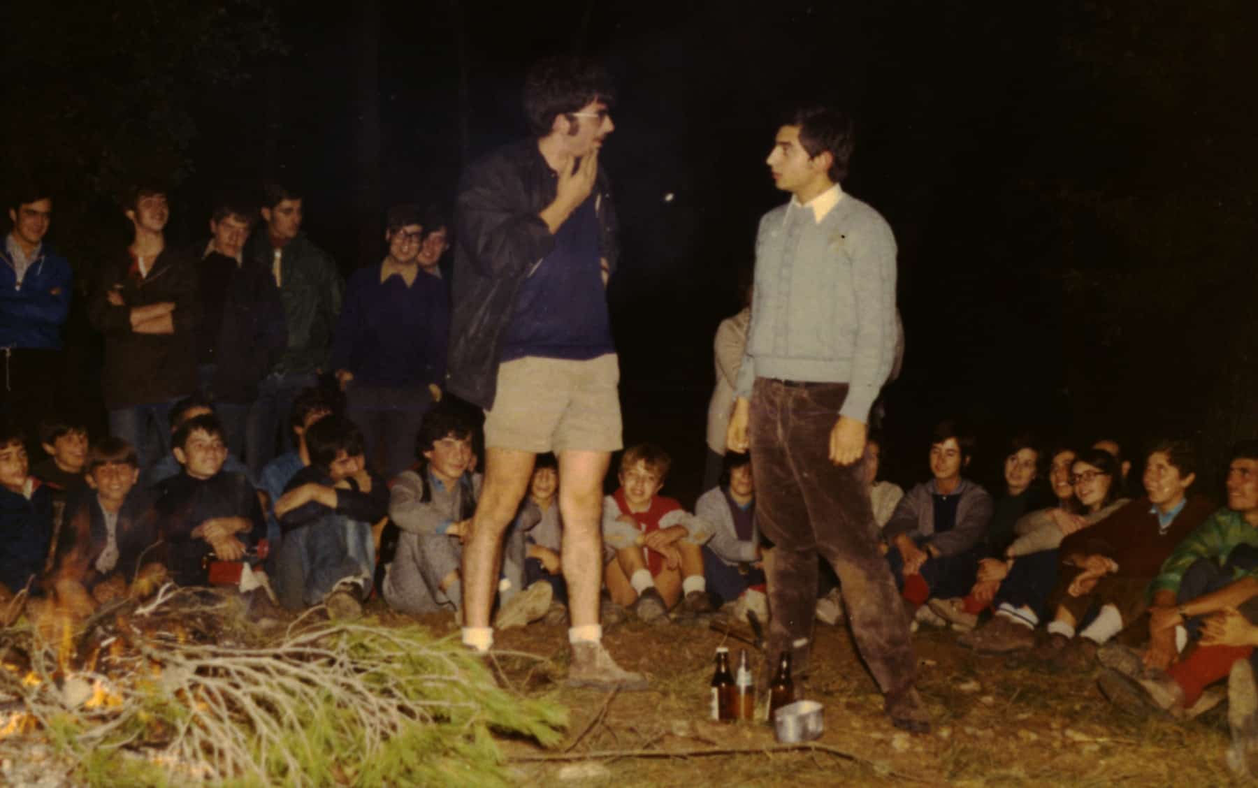 En un temps en què es podia fer foc enmig del bosc, muntàvem el Foc de Camp, l’activitat més divertida, tots al voltant de la foguera on fèiem les actuacions de cada unitat. Alguns l’amenitzaven cantant cançons amb les seves guitarres i la percussió improvisada. Mai hi mancaven els acudits, les imitacions o petites actuacions que havíem preparat en grup. També al llarg de l’any fèiem algunes trobades entre agrupaments: les rutes, la celebració de la Pasqua, les trobades de la cançó escolta… D’arrels en moviments van sorgir grups de Folk com els Sis d’aquí, Barba-roig… que van posar melodia al nostre dia a dia de joventut en què ressonaven les cançons de Xesco Boix, els Esquirols, Grup de Folk, els Setze Jutges…