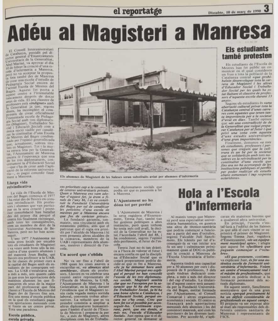 El 19 de febrer del 1990 va ser el Vicerector de la UAB el Dr. Pere Lluís Font qui va comunicar a l’Escola, -amb perplexitat i sense entendre la decisió política-, l’acord del Consell Interuniversitari de Catalunya de crear una Escola d’Infermeria a Manresa i no una Escola de Magisteri.