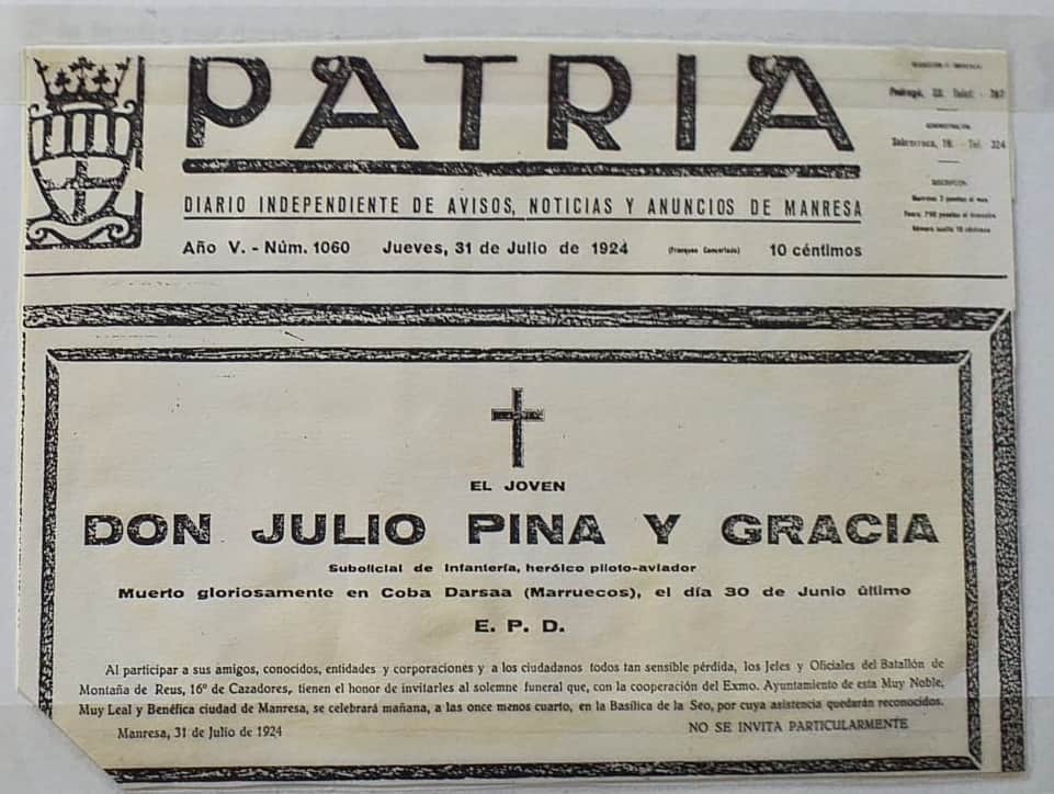 Acabada la lectura, els sacerdots van cantar les absoltes de costum, mentre les campanes tocaven a mort per tercera vegada aquell matí… Han passat molts d’anys des d’aquell matí calorós d’estiu i han plogut els suficients esdeveniments perquè hom s’hagi oblidat de les guerres colonials sense massa retrets. De ben segur que la història d’en Julio Pina pot considerar-se com una més de les moltes que varen enrondar desgraciadament la guerra del Rif, entre la vergonya i l’èpica segons qui n’era el cronista. Si us en faig memòria és per tres raons bàsiques: la interessant personalitat del protagonista del relat, la coincidència amb les primeres tentines de l’aeronàutica espanyola en les que poc o molt hi participaren els manresans germans Novell, i l’esquer periodístic innegable que un aviador manresà fos proposat per primera i única vegada a la més alta recompensa militar, la Llorejada.