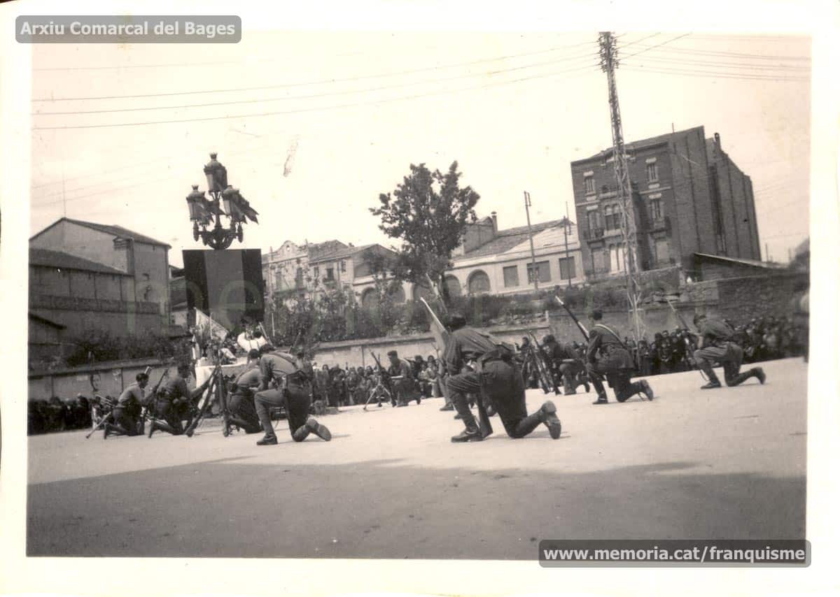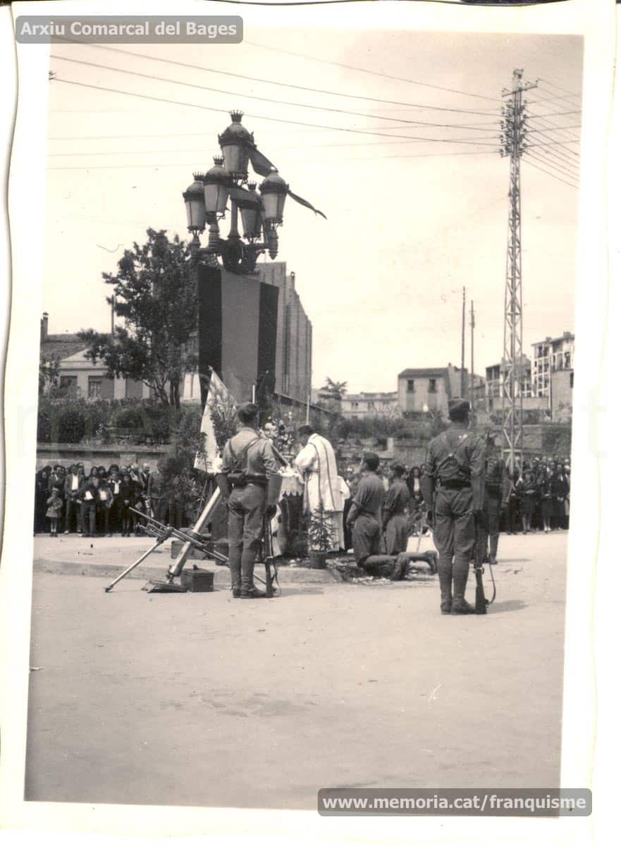Al cementiri, al damunt d’un empostissat, hi havia la missa, que acostumava a celebrar el rector de la Seu. Un cop acabada, pujava l’alcalde i cap municipal del “Movimiento” amb una camisa de color blau fosc i corbata negra i llegia “La oración de los Caídos”. Un cop acabada, tornava a baixar i es posava davant del modest monument “De los Caídos por Dios y por España”; amb el braç enlaire i alçant la veu deia “Caídos por Dios y España” i es corejava el “Presentes”.
