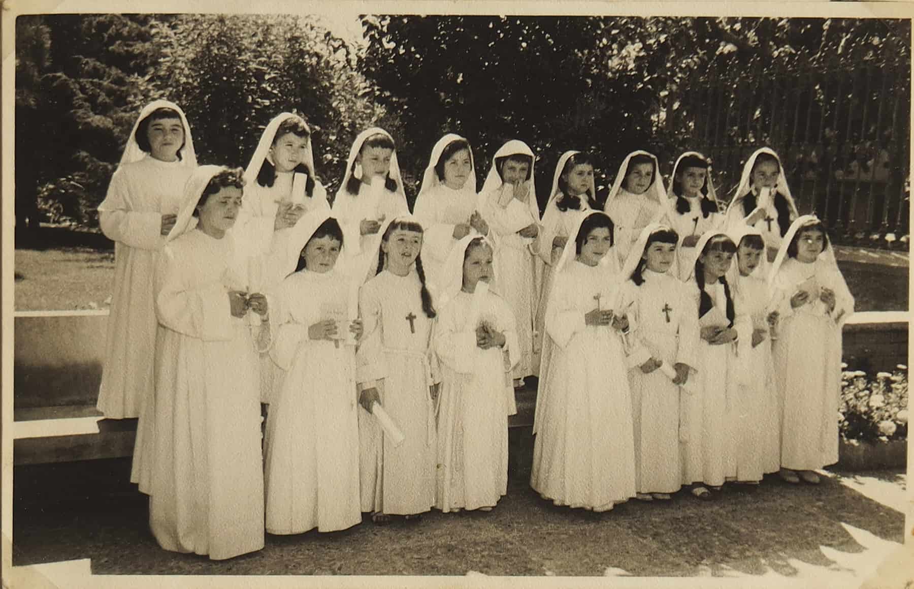 Quan teníem set anys totes les nenes fèiem la primera comunió juntes. Les monges i el mossèn de l’escola ens feien la catequesi. Apreníem amb un petit llibre que es deia el catecismo, i si no te’l sabies de memòria no podies fer la comunió. El vestit de la comunió era per a totes igual: túnica, caputxa, cordó blanc lligat a la cintura i creu de fusta penjada al coll. La voluntat d’uniformar l’aparença era sempre present: l’uniforme, la bata, l’abric, i el vestit per la primera comunió.