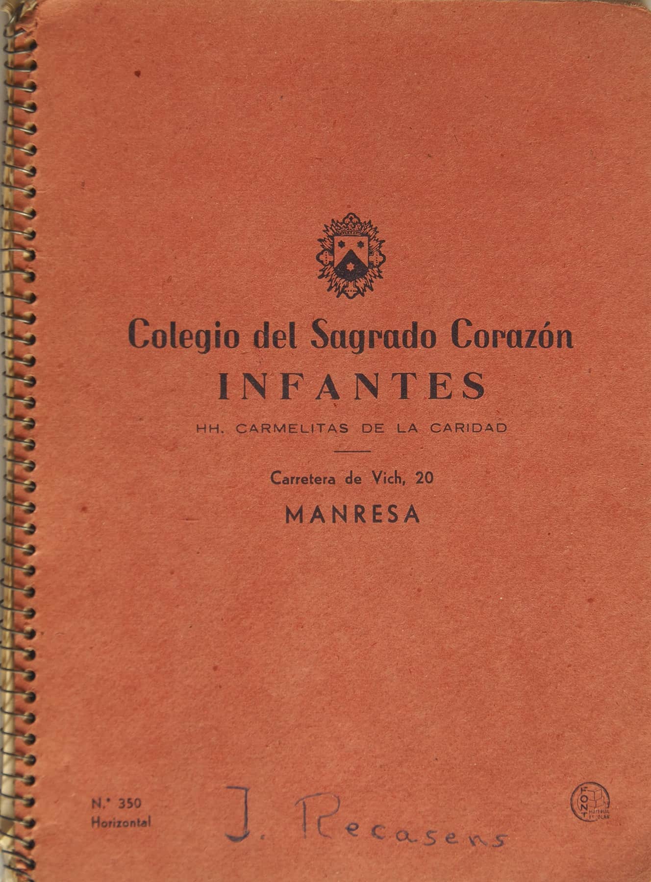 L’any 1965, l’escola de Casa Caritat es va fusionar amb la dels Infants -totes dues regentades per la congregació de les Carmelites de la Caritat fundada per Santa Joaquima de Vedruna per cuidar malalts i escolaritzar nenes pobres- i totes les nenes vàrem passar a la nova escola. Allà hi vam trobar les que ja eren alumnes dels “Infants”, les que venien d’escoles més petites de barri, o parroquials, o d’altres pobles. Allà vàrem fer el curs que en dèiem l’ingrés al batxillerat. Ens venia a examinar professorat de l’institut Lluís de Peguera. Recordo que l’examen consistia en un dictat, una redacció i una arrel quadrada però el més important eren les faltes d’ortografia. Evidentment tot l’ensenyament es feia en castellà. Estudiàvem amb un únic llibre que es deia APTO i que contenia totes les matèries.