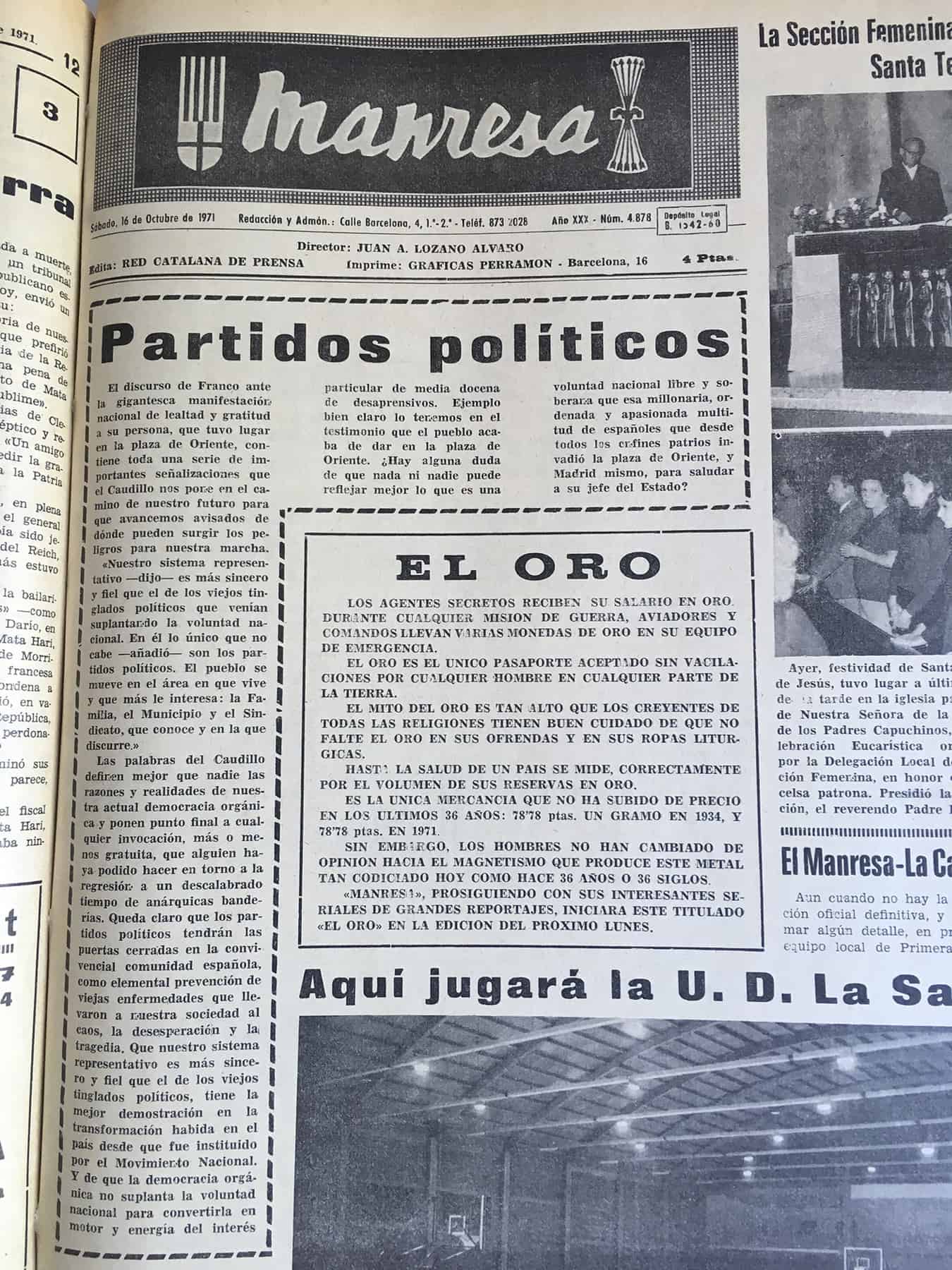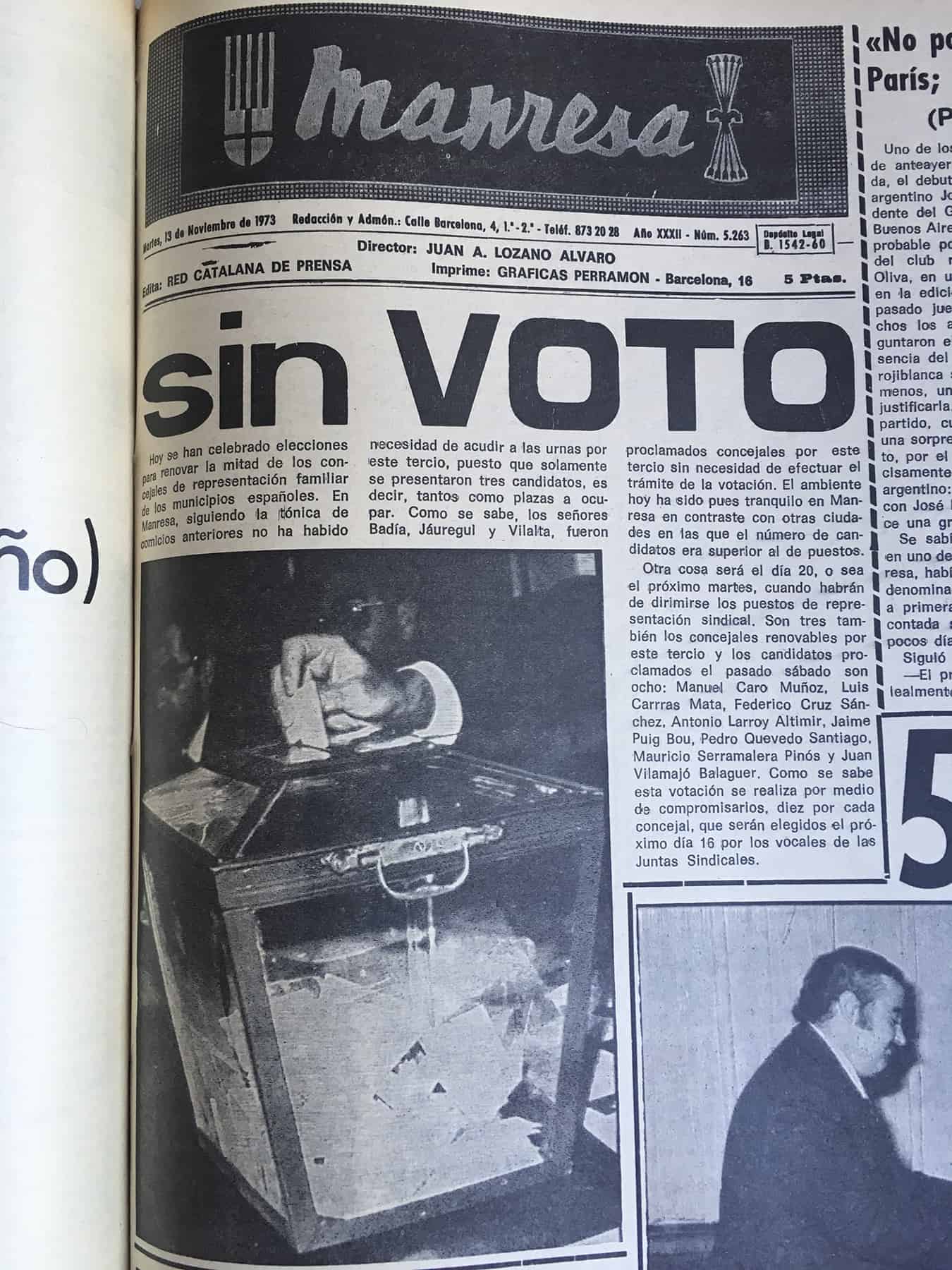 “Han estat convocades eleccions de concejals de l’Ajuntament pel Terç Familiar el dia 13. Què signifiquen aquestes eleccions? Que tenen dret a elegir només els pares de família, quan sembla que l’hauríem de tenir tothom a partir dels divuit o com a màxim vint-i-un anys, quan ja es té suficient seny per saber el que es vol. Per altra banda, els caps de família només elegeixen a la tercera part dels concejals. La resta és elegit a través de vies indirectes com el sindicat i les entitats, ja se sap que usant el camí indirecte es poden manipular molt bé. Per cert que en una nota de “La Vanguardia”, l’onze d’octubre es deia que en la llista del Govern Civil amb les entitats culturals o recreatives amb dret a votar concejals, Manresa no en tenia cap. És curiós com amb tantes entitats culturals i recreatives manresanes, que prou pena passen econòmicament, encara no tinguin dret a vot. Els concejals que es retiren aquesta vegada són: Jaime Puigbó, Antonio Oriol, Ricardo Puig, Bartolomé Amer, José Esquius, Antonio Farré, Antonio Serra Daura, Juan Antonio Pusó y Ramón Riera. Entre ells trobem algun tècnic més o menys eficaç, algun feixista i bastants vividors. No sabem si aquesta vegada hi hauran eleccions a Manresa. Perquè des del temps de la Generalitat de Catalunya no n’hi ha hagut i s’ho han manegat tots els de l’olla. Però tant si n’hi ha com si no, volem deixar clar que mentre els ciutadans no tinguem dret a vot per elegir tots els concejals i també a l’alcalde, els nostres problemes no seran atesos”.