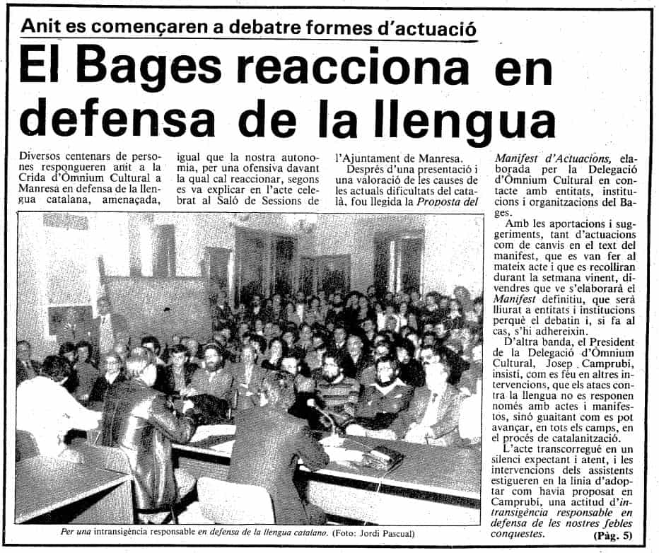 A Manresa, el divendres 20 de febrer al vespre centenars de persones es reuniren al saló de sessions de l’Ajuntament, responent a la crida de la delegació d’Òmnium Cultural «en defensa de la llengua i de l’autonomia que es consideren amenaçades», segons va informar l’endemà el diari Regió7. Conduit per Josep Camprubí Casas, president de la delegació comarcal d’Òmnium, l’acte va presentar i debatre una proposta de «manifest d’actuacions» elaborat per Òmnium després de mantenir contactes amb altres entitats. L’actitud necessària, segons va resumir-la Camprubí, era la «intransigència responsable en defensa de les nostres febles conquestes».