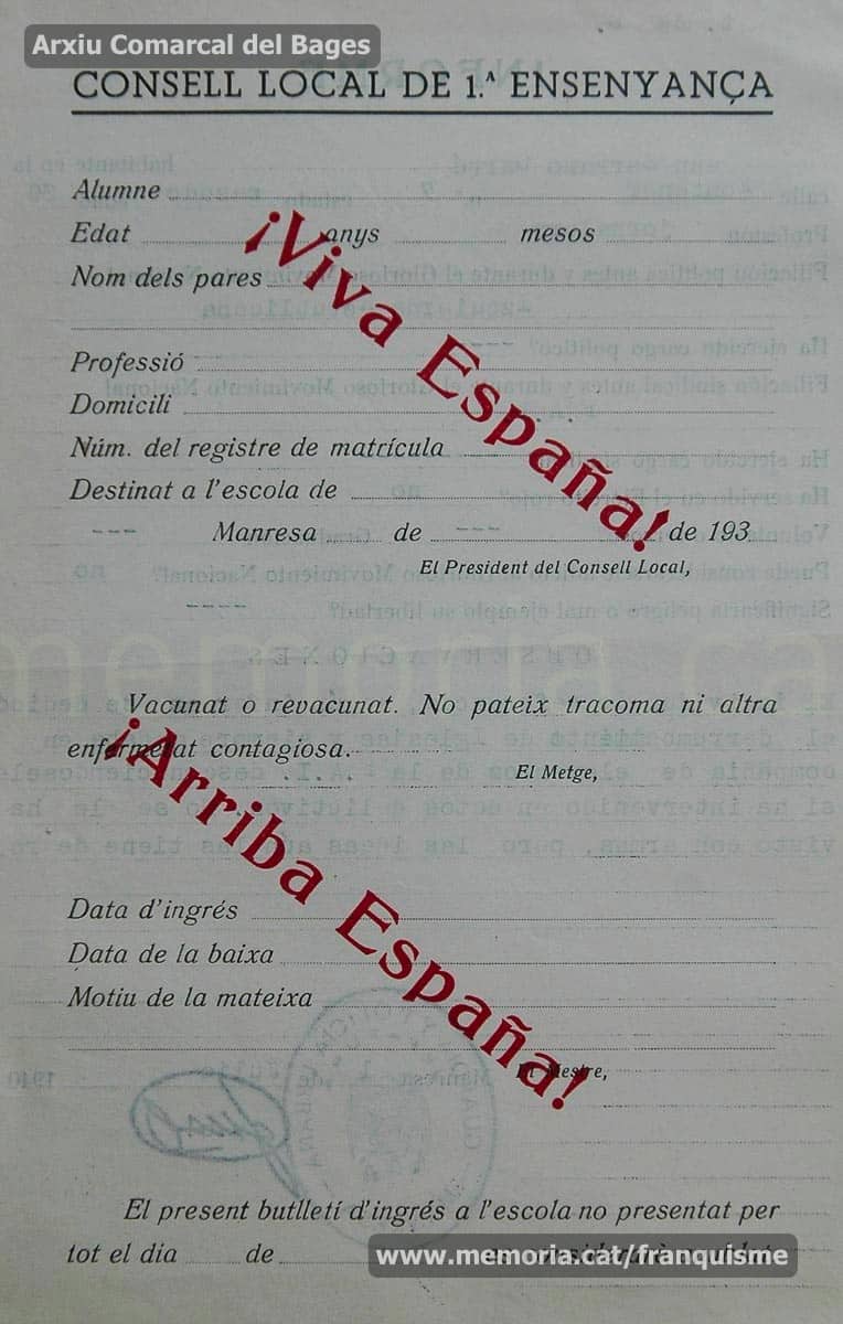 Inscripcions franquistes en un document de la Manresa republicana. (Arxiu Comarcal del Bages)