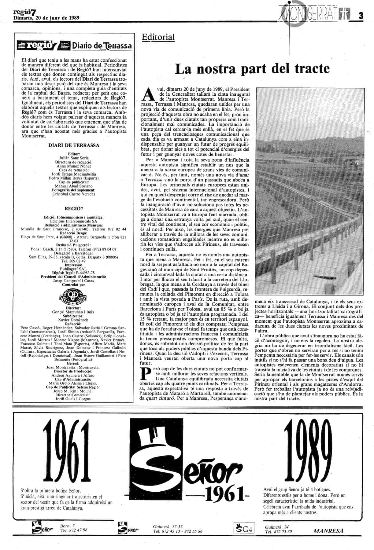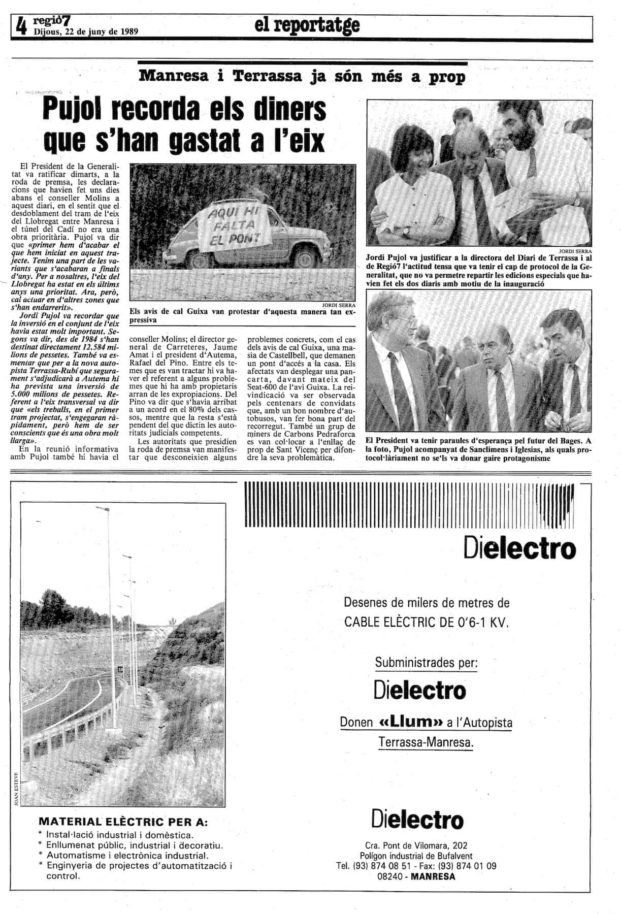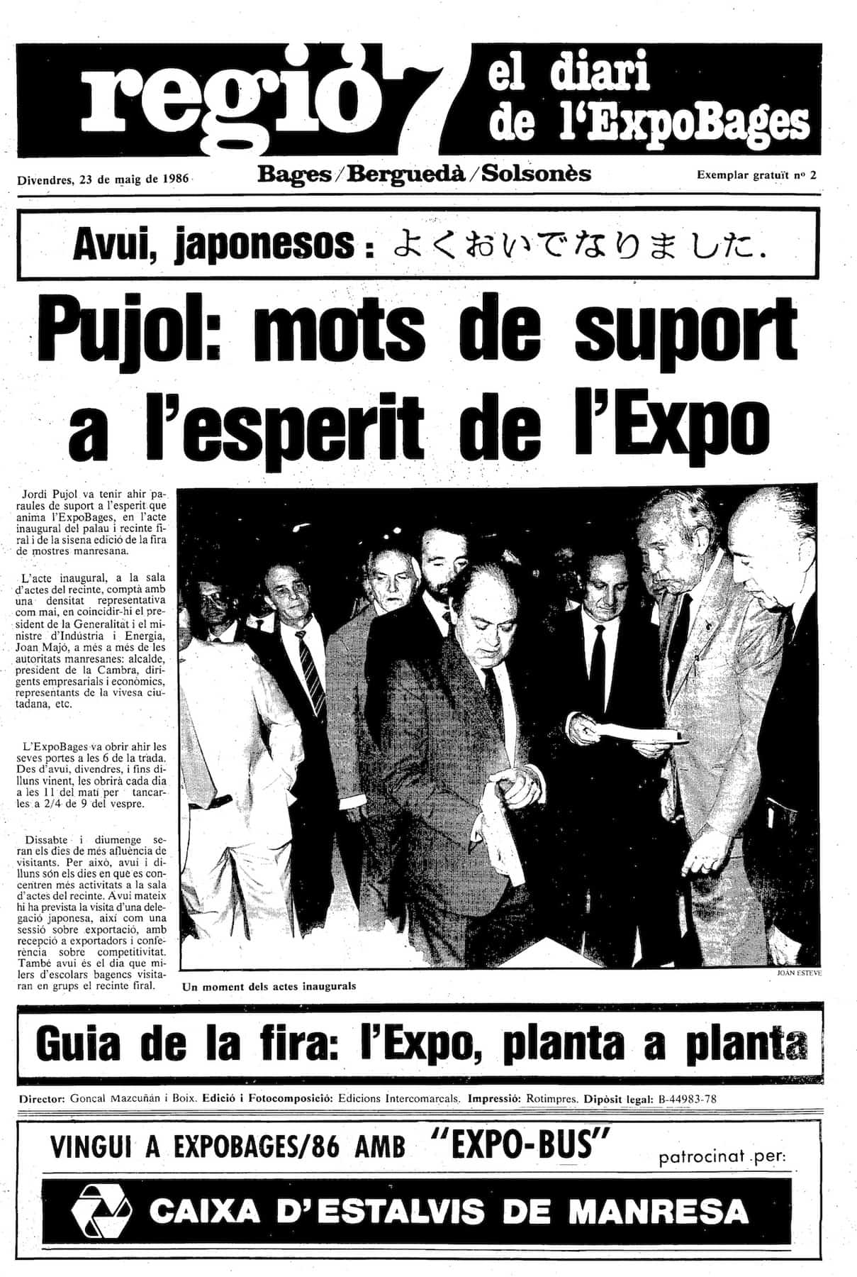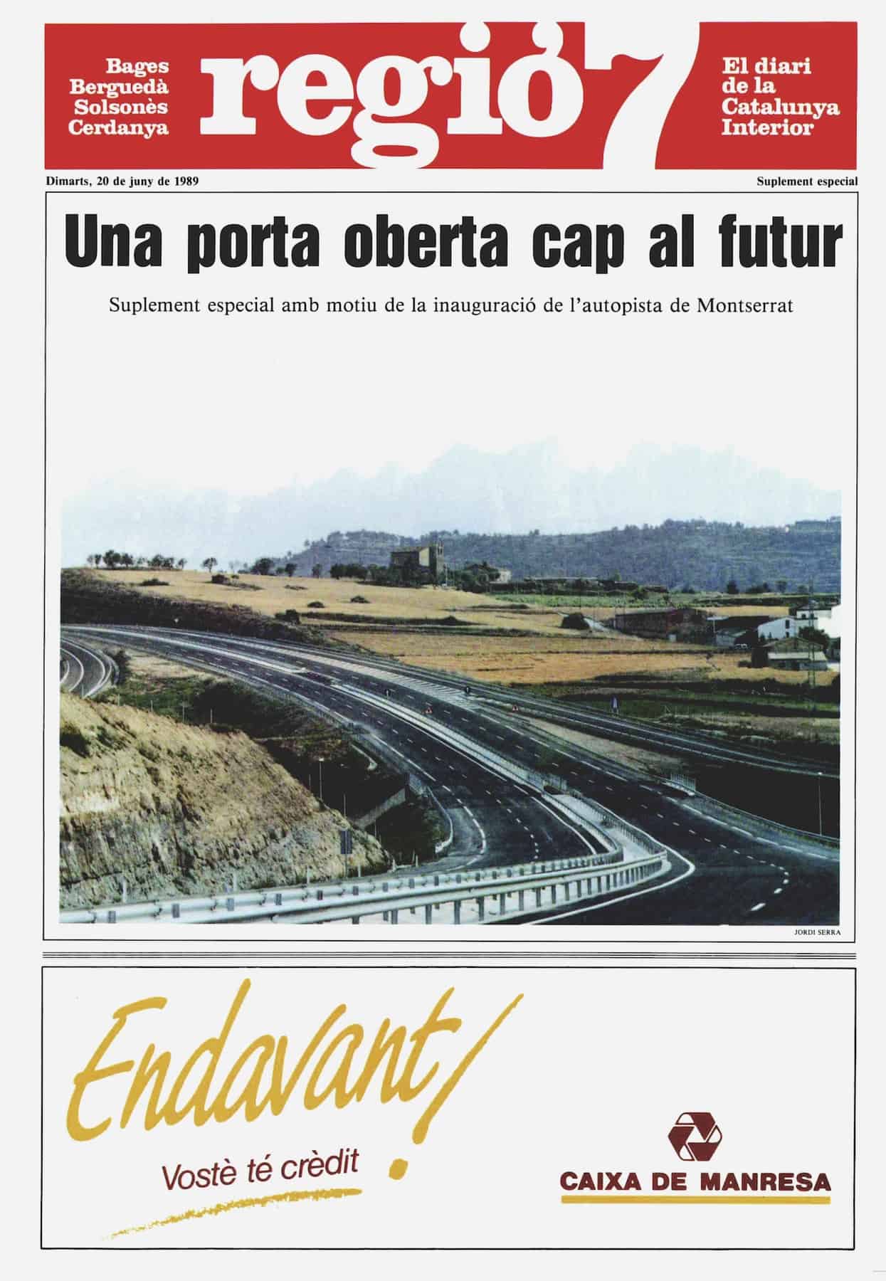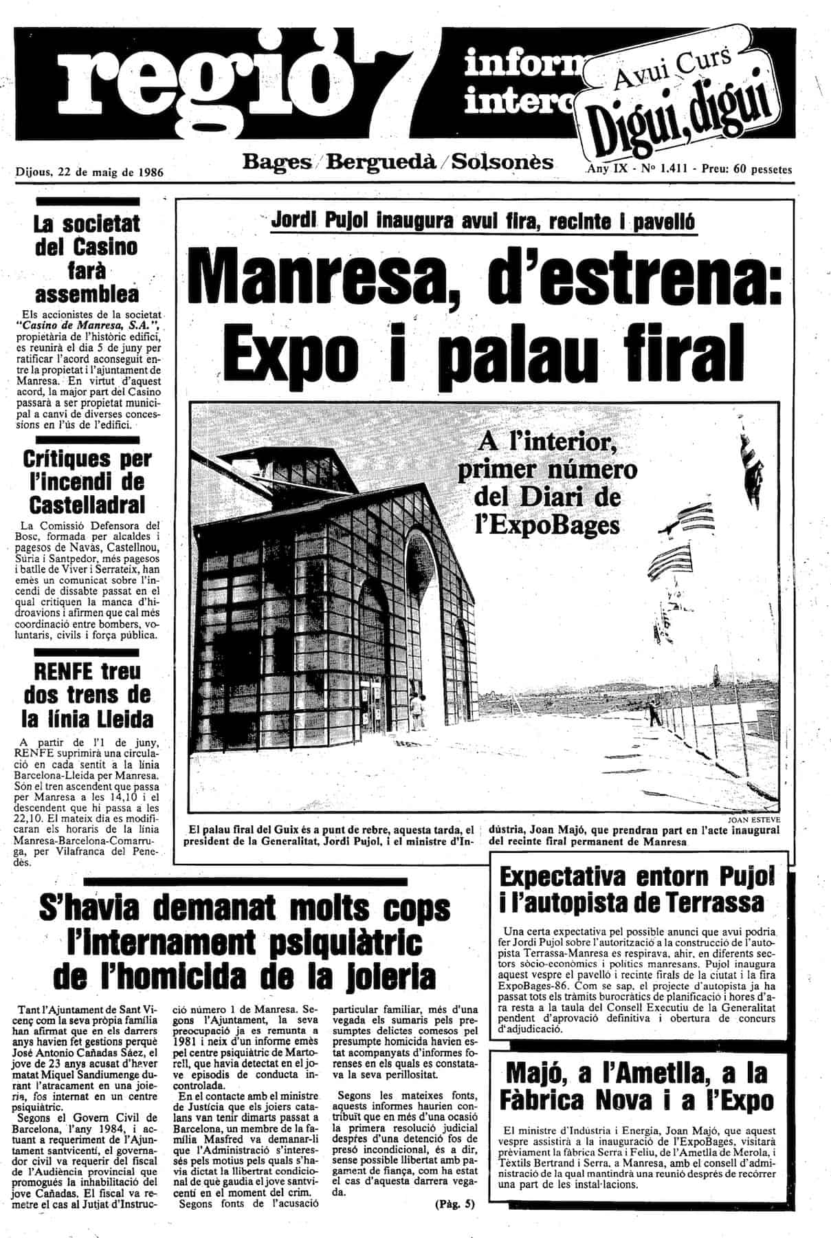 Aquell dia, segons podeu comprovar a l’Hemeroteca, Regió7 obria portada a quatre columnes i foto grossa: “Manresa, d’estrena: Expo i palau firal”. En l’avanttítol s’especificava: “Jordi Pujol inaugura avui fira, recinte i pavelló”. Si repasseu la resta de titulars hi trobareu notícies prou importants que aquell dia es van veure relegades a una mínima expressió, condicionades precisament per l‘espai dedicat al tema del palau firal. Pareu atenció, però, a un requadre que apareix sota, a la dreta, envaint lleugerament el filetejat de la notícia gran, que anuncia el següent: “Expectativa entorn Pujol I l’autopista de Terrassa.- Una certa expectativa pel possible anunci que avui podria fer Jordi Pujol sobre l’autorització a la construcció de l’autopista Terrassa-Manresa es respirava, ahir, en diferents sectors socioeconòmics i polítics manresans. Pujol inaugura aquest vespre el pavelló i recinte firals de la ciutat i la fira ExpoBages-86. Com se sap, el projecte d’autopista ja ha passat tot els tràmits burocràtics de planificació i hores d’ara resta a la taula del Consell Executiu de la Generalitat pendent d’aprovació definitiva i obertura de concurs d’adjudicació.”