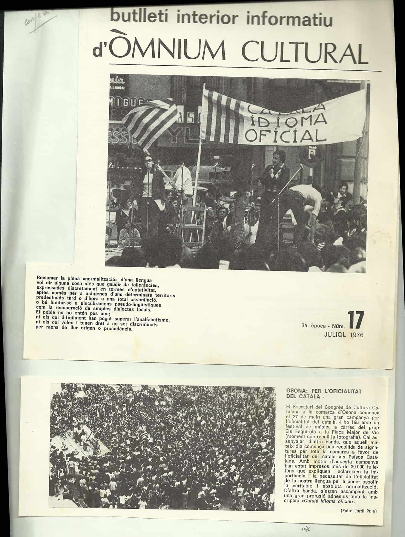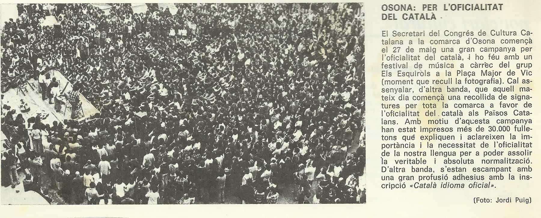 «El Secretariat del Congrés de Cultura Catalana a la comarca d’Osona començà el 27 de maig una gran campanya per l’oficialitat del català, i ho féu amb un festival de música a càrrec del grup Els Esquirols, a la plaça Major de Vic (moment que recull la fotografia). Cal assenyalar d’altra banda, que aquell mateix dia començà una recollida de signatures per tota la comarca a favor de l’oficialitat del català als Països Catalans. Amb motiu d’aquesta campanya han estat impresos més de 30.000 fulletons que expliquen i aclareixen la importància i la necessitat de l’oficialitat de la nostra llengua per a poder assolir la veritable i absoluta normalització. D’altra banda, s’estan escampant amb una gran profusió adhesius amb la inscripció “Català, idioma oficial”. »