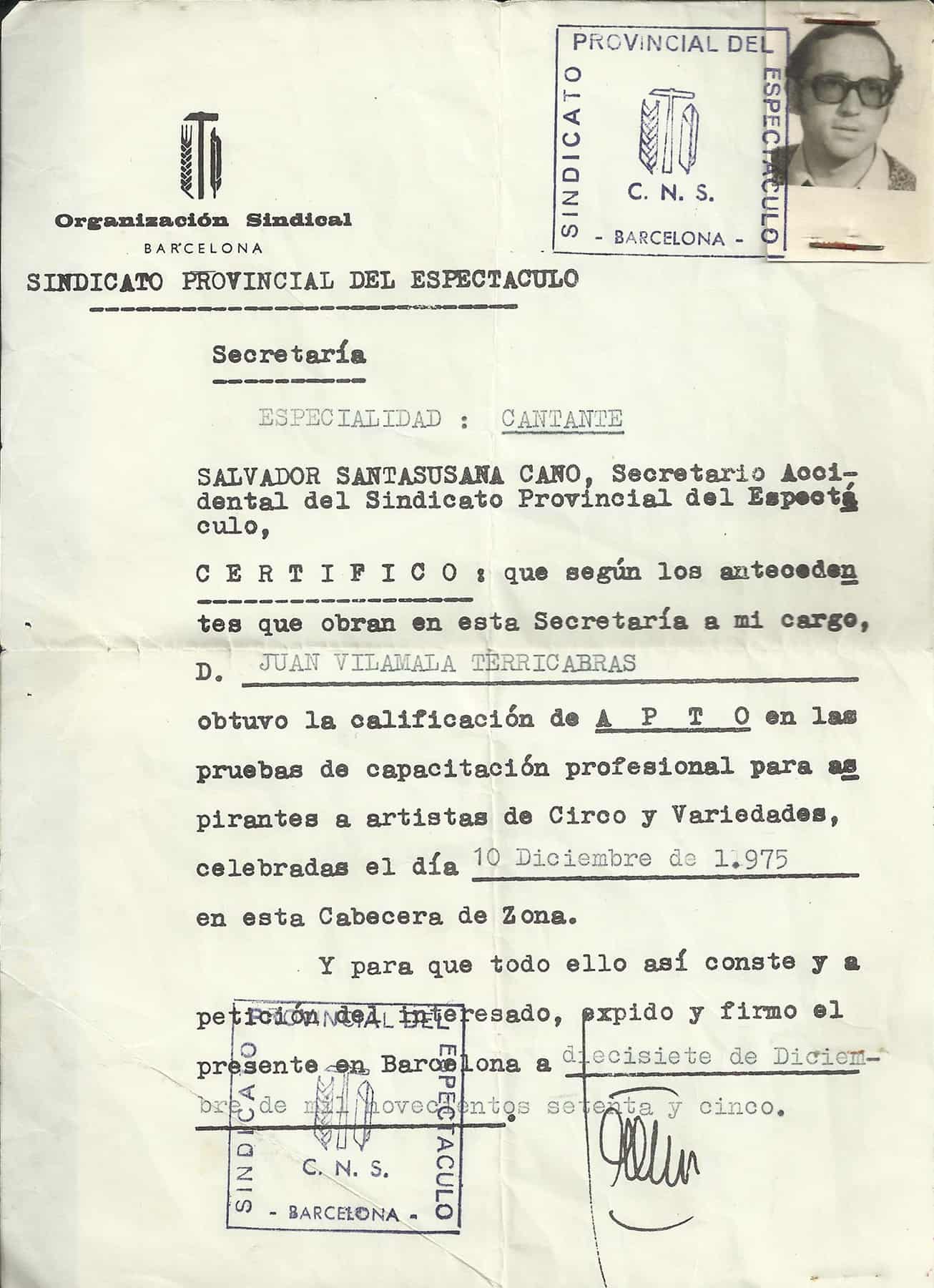 «Organización Sindical. Barcelona. Secretaría. Especialidad: cantante. Salvador Santasusana Cano, secretario accidental del Sindicato Provincial del Espectáculo Certifico que según los antecedentes que obran en esta secretaría a mi cargo D. Juan Vilamala Terricabras obtuvo la calificación de Apto en las pruebas de capacitación profesional para aspirantes a artistas de Circo i Variedades, celebradas el día 10 de Diciembre de 1975, en esta Cabecera de Zona. Y para que todo ello así conste y a petición del interesado, expido y firmo el presente en Barcelona a diecisiete de Diciembre de mil nuevecientos setenta i cinco.»