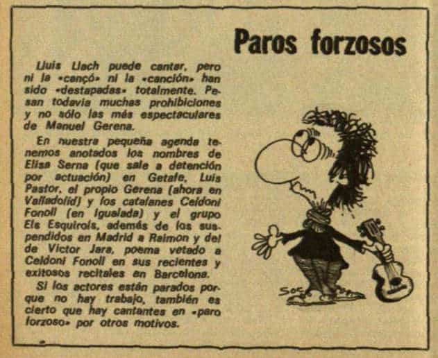 «Paros forzosos. Lluís Llach puede cantar, pero ni la “cançó” ni la “canción” han sido “destapadas” totalmente. Pesan todavía muchas prohibiciones y no sólo las más espectaculares de Manuel Gerena. En nuestra pequeña agenda tenemos anotados los nombres de Elisa Serna en Getafe, Luis Pastor, el propio Gerena (ahora en Valladolid) y los catalanes Celdoni Fonoll (en Igualada) y el grupo Els Esquirols, además de los recitales suspendidos en Madrid a Raimon y del tema de Víctor Jara, poema vetado a Celdoni Fonoll, en sus actuaciones recientes y exitosos recitales en Barcelona. Si los actores están parados porque no hay trabajo, también es cierto que hay cantantes en “paro forzoso” por otros motivos.»