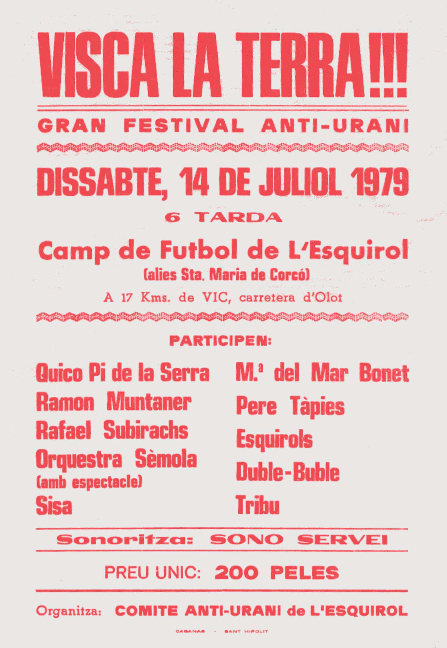 «Visca la Terra!: festival para defender una comarca. Vic. El pasado sábado y hasta que el cuerpo de las més de seis mil personas aguantó, se celebró el Festival Anti-uranio en la pequeña localidad de L’Esquirol, próxima a Vic. El fantasma del bandolero Joan de Serrallonga, esta vez convertido en ecologista, sobrevolaba a ritmo musical los campos de Osona bajo el lema “Visca la Terra!”, y que el comité organizador y todo el pueblo de L’Esquirol lo tomaron prestado para bautizar el festival….»
