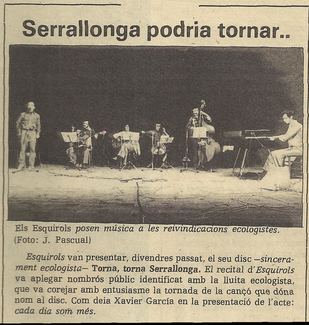 «Quatre mesos i escaig després del seu enregistrament als estudis Gema 1 de Barcelona ha estat publicat recentment el nou àlbum discogràfic de llarga durada del conjunt Esquirols, Torna, torna, Serrallonga, una obra que marca un gran pas endavant en el treball d’aquest grup músico-vocal, i que representa per altra banda la novetat no gens negligible de ser pràcticament la primera gravació que amb caràcter gairebé monogràfic aplega tot un seguit de cançons de contingut ecologista o, com molt bé diu Xavier Garcia en presentar el disc, la primera mostra essencialment dedicada a la cançó de supervivència com a espècie humana i com a col·lectivitat nacional dintre d’un territori que perd el seu alè per moments”.