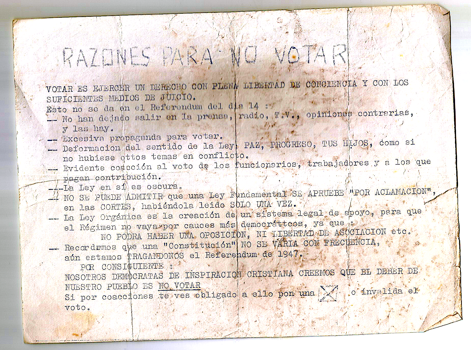 Una octaveta, segurament feta amb una copiadora a mà, a tinta, una “vietnamita” on s’havia de copiar full a full. Gairebé que aquest mig full ciclostilat és ja un document, un document amb vuit arguments i encapçalat per un títol: “Razones para no votar”, i entre els que es pot llegir: