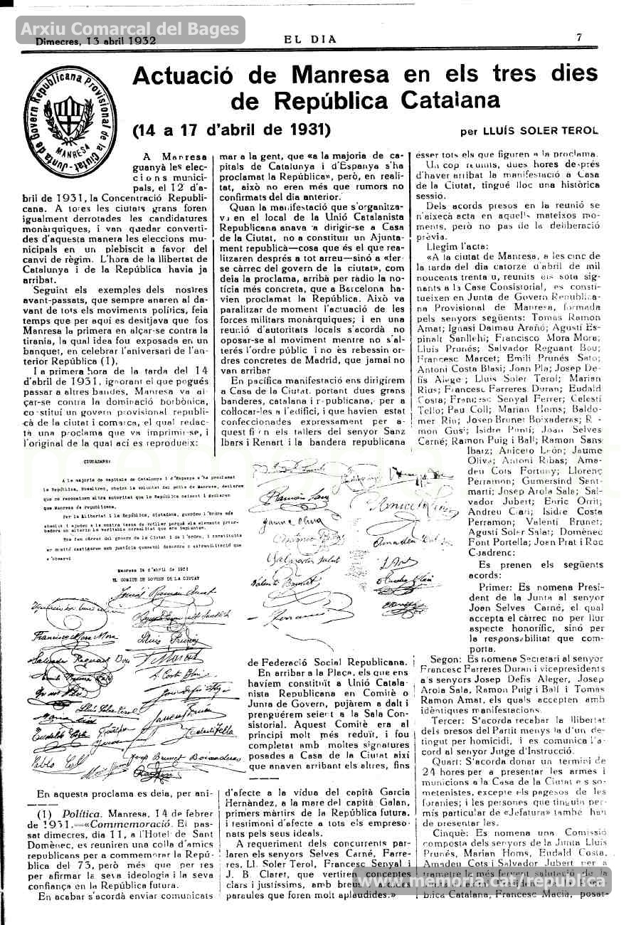 Actuació de Manresa en els tres dies de República Catalana (14 a 17 d’abril de 1931)