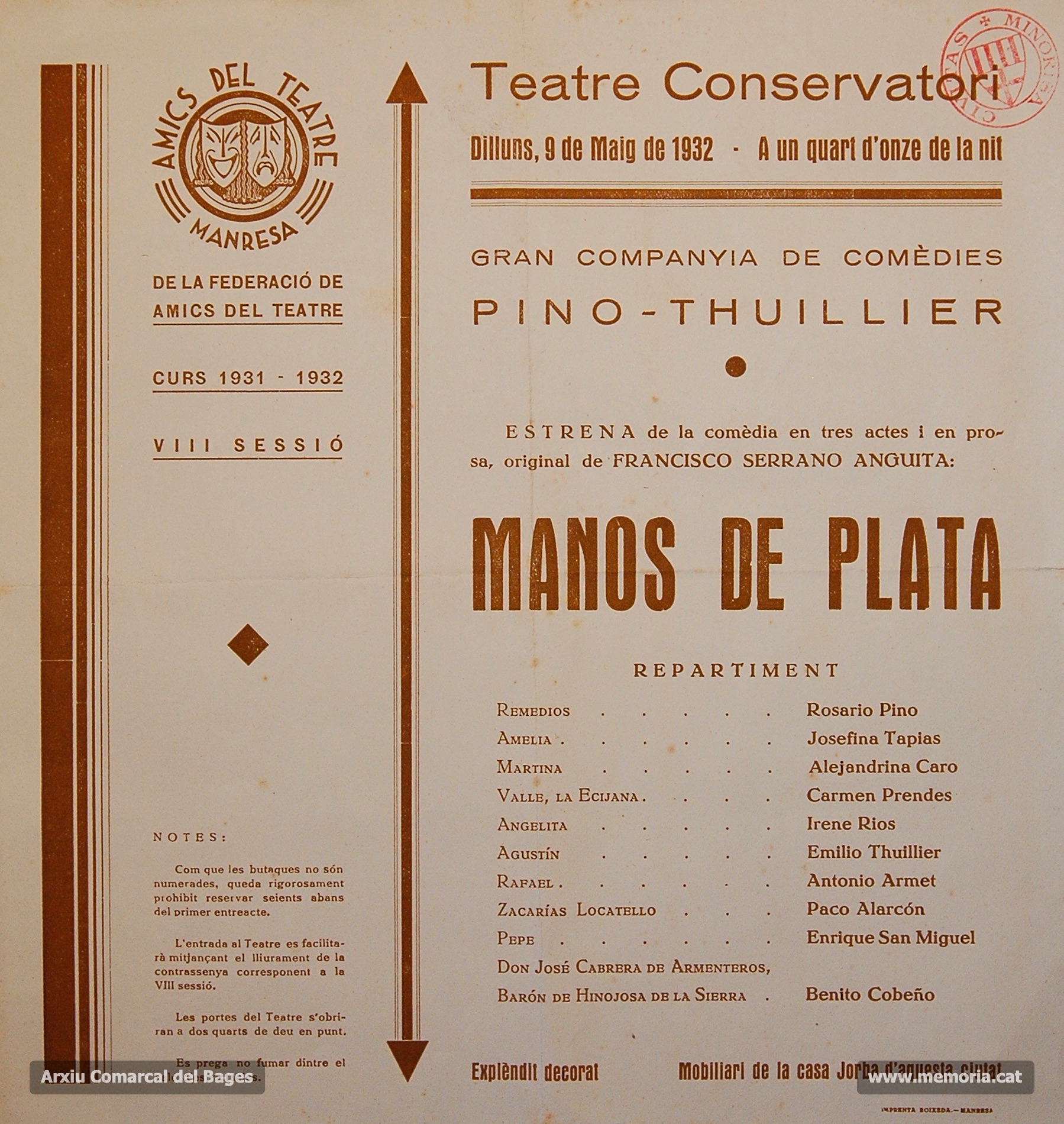 Anys 1930-1935: Programes de diverses sessions dramàtiques al Teatre Conservatori, destacant “Fuenteovejuna” de Lope de Vega a càrrec de la companyia de Margarida Xirgu i de “L’Hostal de la Glòria” de Josep Maria de Sagarra a càrrec de la gran Companyia Catalana Vila-Daví; representació a l’Hotel Granja Mundial de les “Bodas de sangre” de Federico Garcia Lorca per la Companyia còmico-dramàtica espanyola.