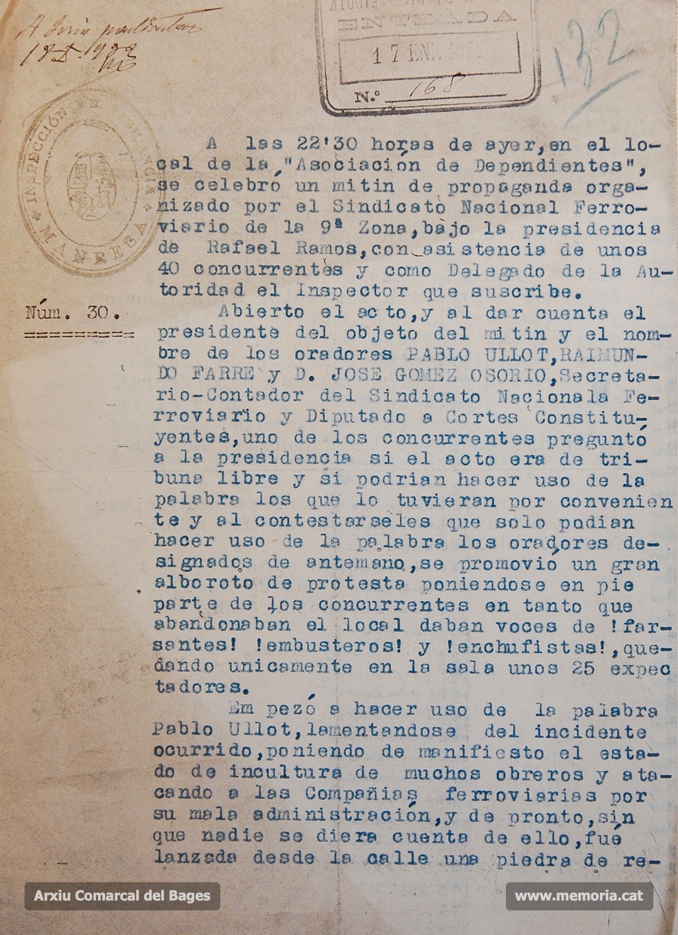 L’ambient a Manresa és tens. El gener del 1932 hi ha aldarulls en un míting organitzat pel Sindicat Nacional de Ferroviaris celebrat al local de l’ADCI.