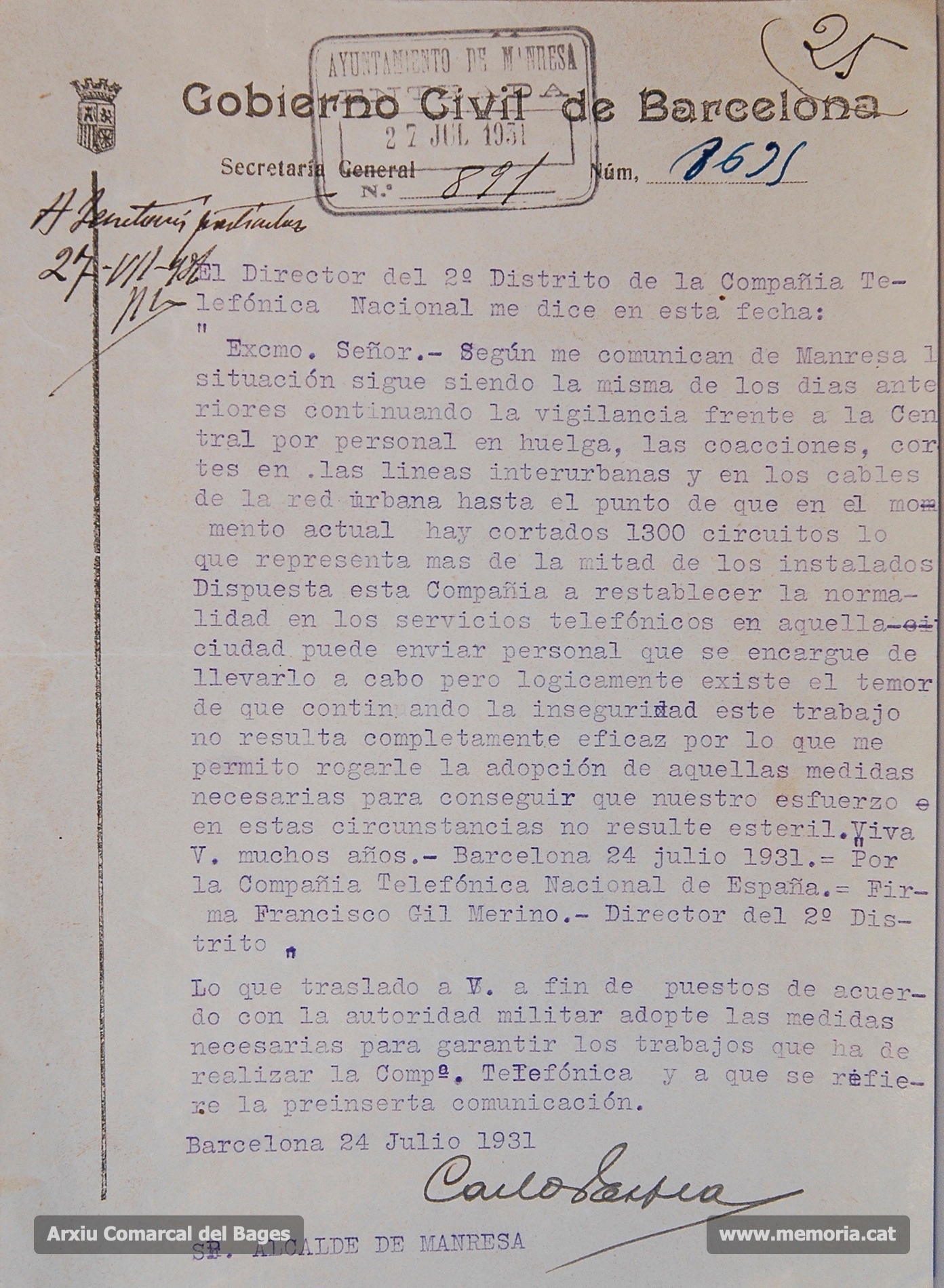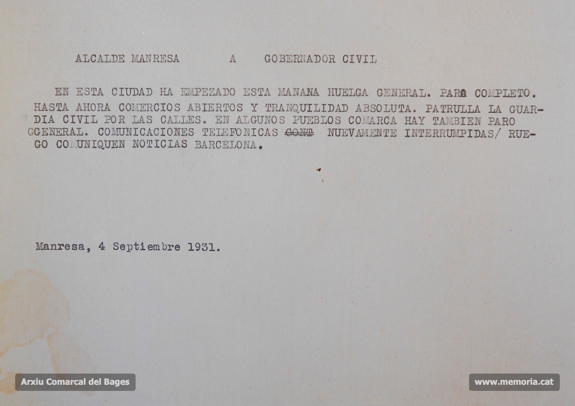 Any 1931. Comunicats de l’alcalde de Manresa, Lluís Prunés, cap al Governador Civil de Barcelona en els quals l’informa de la vaga general i de l’afectació del servei telefònic pels continus actes de sabotatge així com de les mesures preses per intentar restablir el servei. Telegrames del Governador Civil adreçats a l’alcalde sobre la vigilància de la línia telefònica, de la protecció, davant les coaccions dels sindicats, dels treballadors reingressats i de l’amenaça de la Telefònica de tancar la central si no els donen protecció. Relació de treballadors de la Telefònica reingressats.