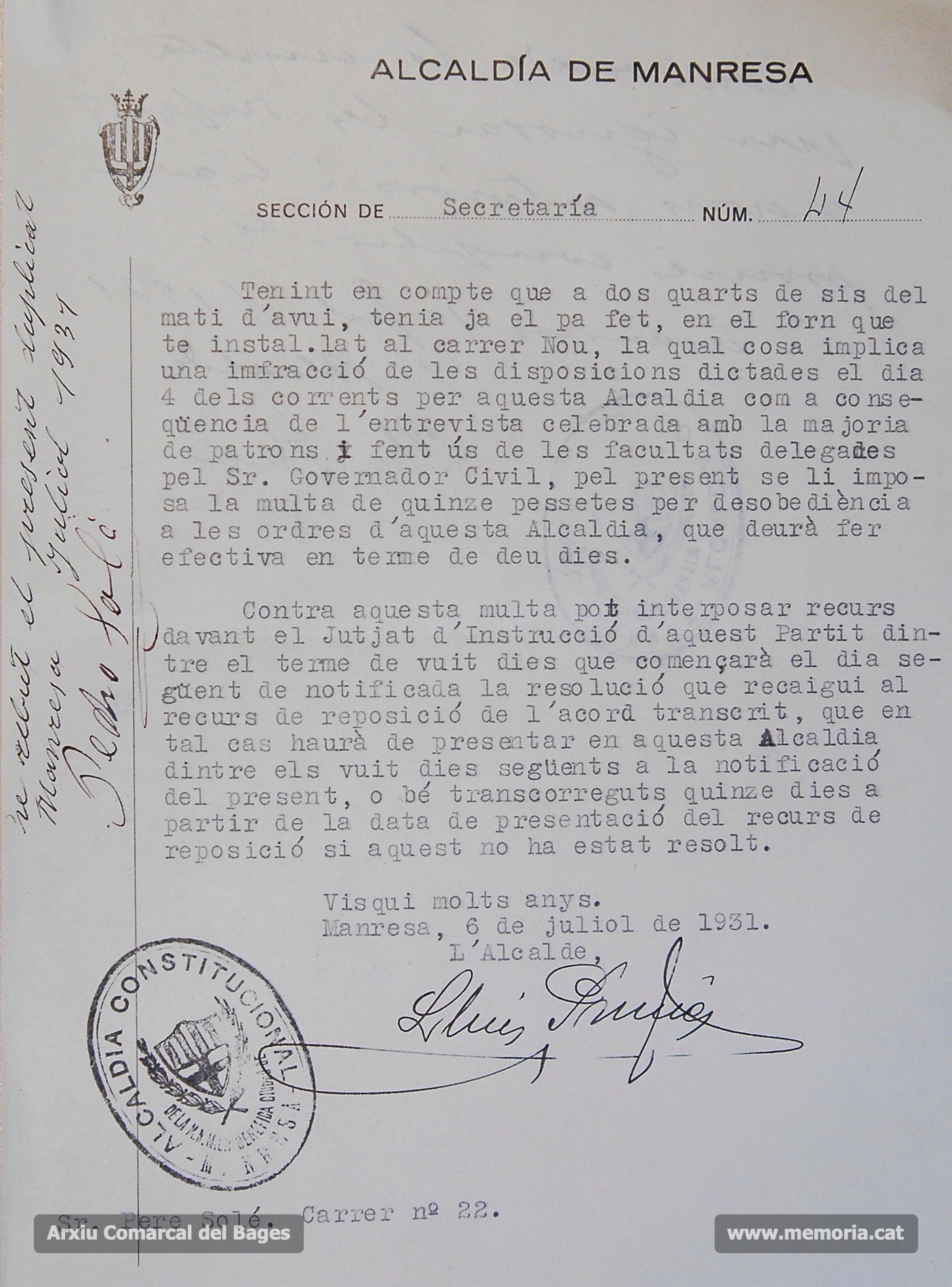 Any 1931. Relació dels forners de Manresa. Carta del Sindicat del Ram de l’Alimentació a l’alcalde Lluís Prunés on amenacen de fer la vaga de forners si no es discuteixen unes bases de treball. Ordre de l’alcalde per la qual s’exposen unes bases de treball acordades amb els patrons forners. Multa i posterior condonació per ignorància a un forner. Avís a l’alcalde de l’inici de la vaga de forners. Contracte de treball dels forners. Informe de l’alcalde al Governador Civil sobre la vaga parcial de forners del 17 d’agost.