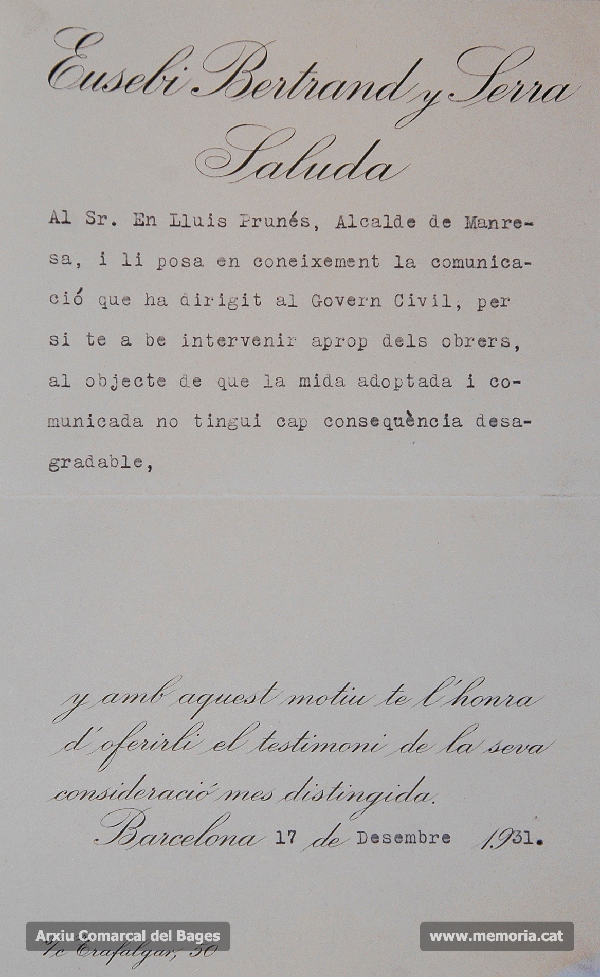 Any 1931. Relació de fàbriques de teixits de Manresa. Pamflet de la CNT Manresa-Berga on criden a la vaga del sector fabril i tèxtil. Pamflet de la CNT de l’Art Fabril sobre uns fets ocorreguts a la fàbrica del Guix. Informes dels delegats governatius de les assemblees de l’Art Fabril sobre l’assegurança de Maternitat i la declaració de la vaga. Cartes al Governador Civil i a l’alcalde Lluís Prunés per part del Sindicat Fabril on anuncien la vaga del sector. Denúncia de l’alcalde de Bagà de la impressió d’un pamflet a favor de la vaga en una impremta manresana.