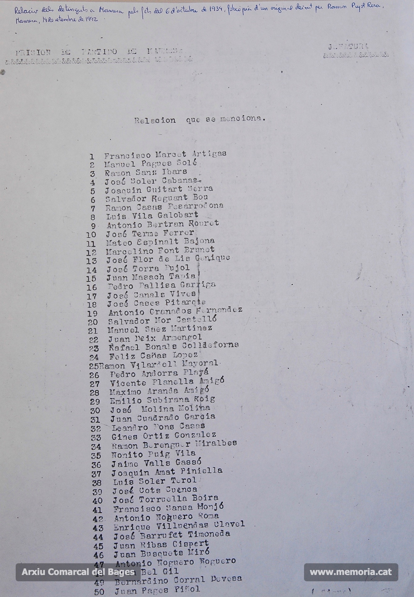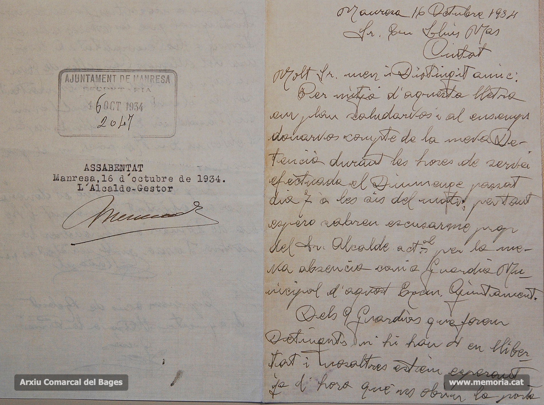 Manresa. Octubre 1934. Relació de detinguts arran dels Fets del 6 d’octubre. Cartes d’alts funcionaris de l’Ajuntament de Manresa (Joan Masats, Marià Homs, Jaume Vall, etc.) en què informen que si no s’han presentat als seus llocs de treball (després del 6 d’octubre) és perquè es troben empresonats. (Documents procedents de l’Arxiu Comarcal del Bages).