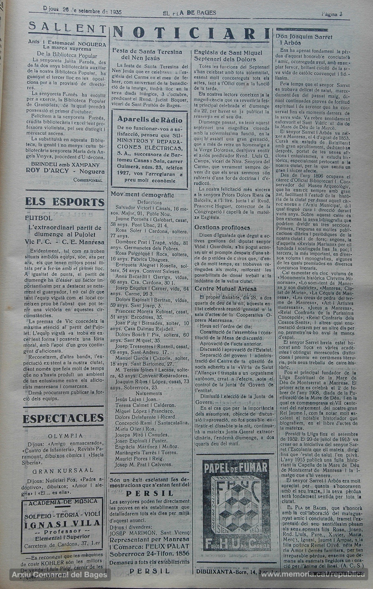 26-9-1935. La notícia de la mort de Joaquim Sarret i Arbós, al diari “El Pla de Bages”
