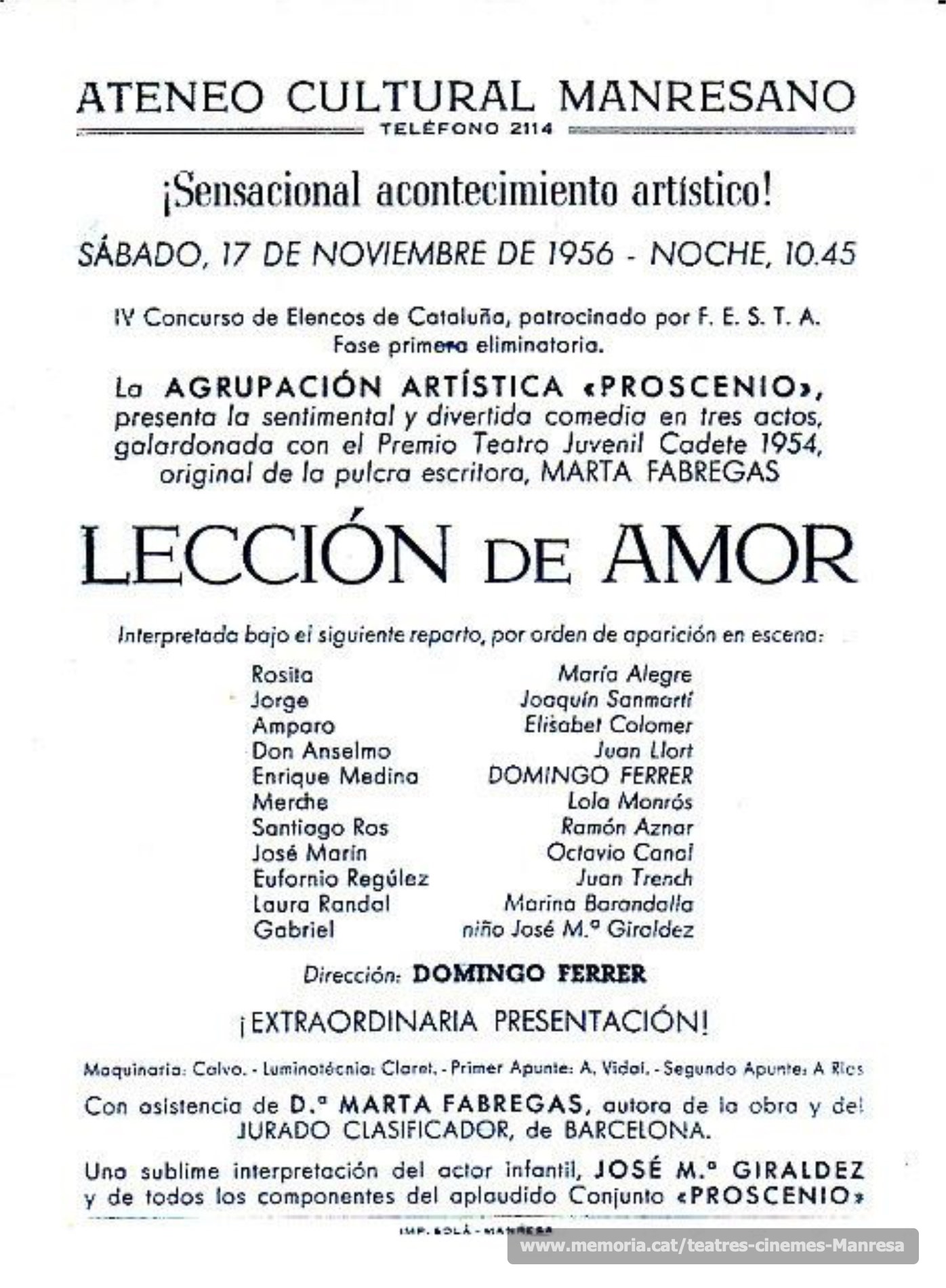Clausurat el 1939, el local va reobrir provisionalment l’any següent com a “Salón Recreo”; i va reprendre les activitats l’any 1941 amb el nom, per ordre governativa, d’Ateneo Cultural Manresano. Aquí s’hi va formar l’agrupació artística “Proscenio”, de la qual en fou el principal impulsor, l’actor i director Domènec Ferrer. El 4 de novembre de 1943 l’Ateneu va retre un homenatge a l’actriu manresana Àgata Puigcerver tot representant l’obra”Don Juan Tenorio” amb Domènec Ferrer en el paper de Don Juan i Àgata Puigcerver en el de Brígida.