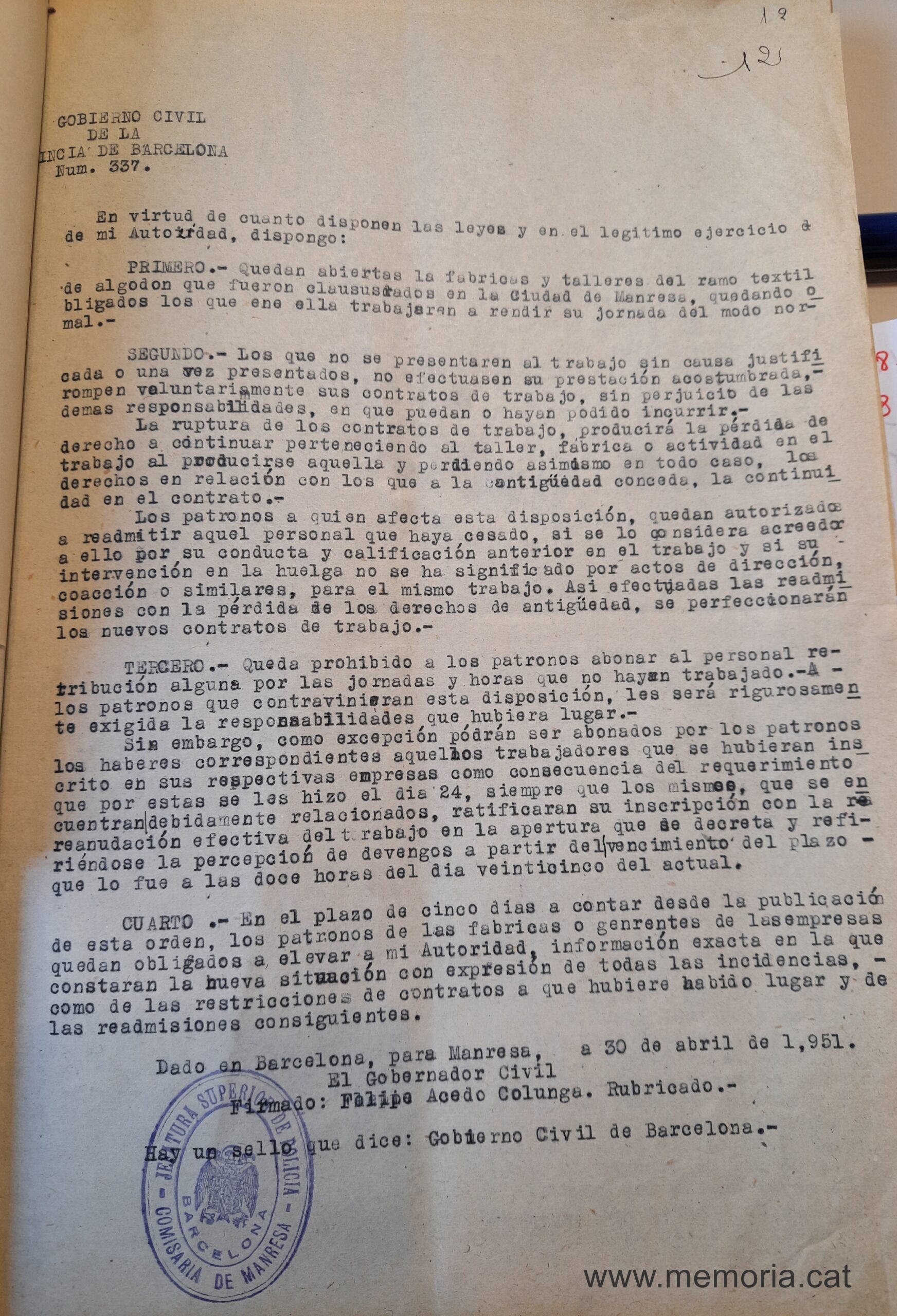 Ban del Governador Civil de Barcelona, Felipe Acedo Colunga, de 30 d’abril de 1951, en relació a la reobertura de les fàbriques.