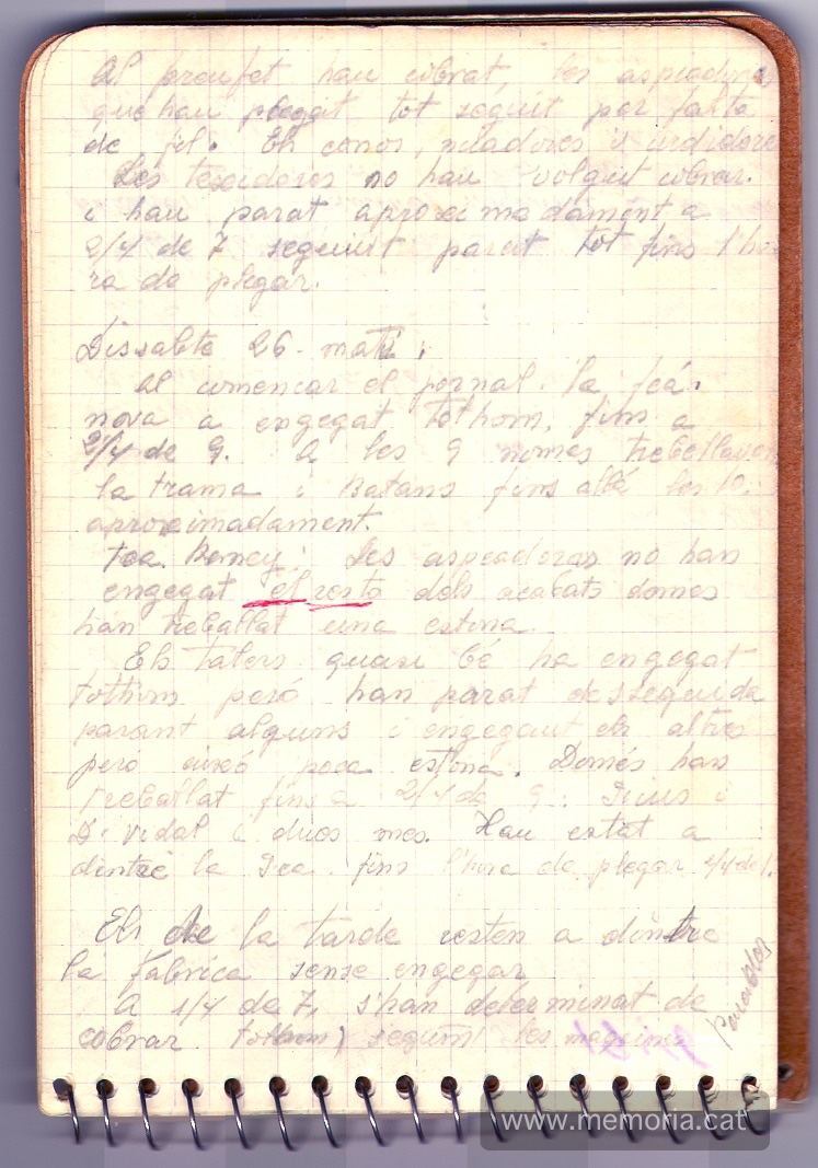 Al seu diari, Laura Sanmiquel anota que durant la tercera setmana de vaga els obrers han treballat 40 hores i s’han mostrat conformes amb la quantitat abonada. Per contra, durant la quarta setmana han treballat tots els dies excepte dijous -amb motiu del dia de la Liberación-, que és una jornada recuperable i, per tant, no es paga. El diari destaca la incidència del divendres 25, en què a l’hora de pagar alguns operaris han aturat les màquines i s’han negat a cobrar. Molts ja no treballaran més, com és el cas de les teixidores. El dissabte 26, al torn de matí ha engegat tothom fins a 2/4 de 9. A continuació han anat aturant-se totes les seccions i només algunes, com la dels acabats, han treballat una estona. Les obreres del torn de tarda resten dins la fàbrica, sense engegar.